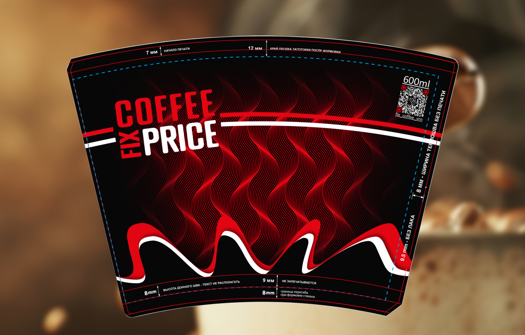 Fix Price желісі күнделікті тауарларға тұрақты бағамен танымал, оның ішінде сусындар да бар. Тапсырыс беруші 600 мл көлеміндегі стакан үшін дизайн жасауды сұрады. Негізгі акценттер: "Coffee Fix Price" атауын ерекшелеп көрсету, заманауи көрініс беру және сергектік ассоциациясын тудыру. Макет қағазға басуға бейімделген, кесу және қауіпсіздік аймақтары есепке алынған.