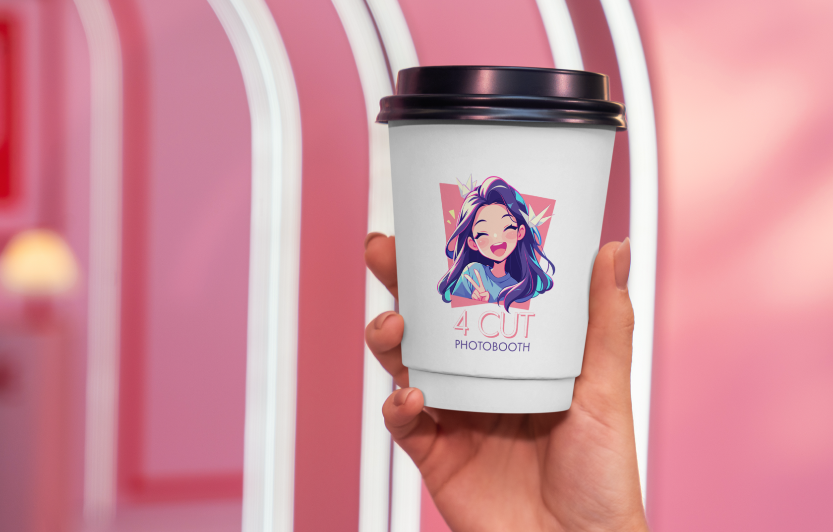 Готовый дизайн упаковки для 4 Cut Photobooth — это не банальный контейнер, а арт-миниатюра. На изображениях видно, как эмблема интегрируется в окружение: рука с стаканом на розовом фоне усиливает связь с уютным кафе. Заказчик зафиксировал подъем активности — пользователи постят в сетях, хэштеги #4CutPhotobooth и #AnimeCoffee набирают обороты.