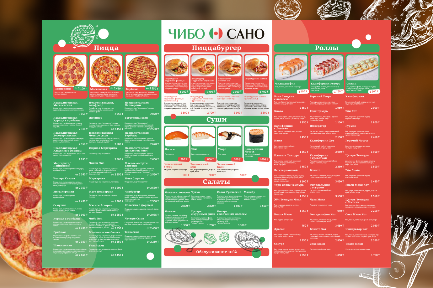 «Чибо Сано» мейрамханасы fast casual форматында жұмыс істейді: мәзірде пицца, пиццабургер, ролл, суши және салат сияқты бірнеше негізгі бағыт бар. Ассортимент көп болған кезде мәзір жай ғана тізім емес, қонаққа бағыт көрсететін құралға айналады. Осы жоба аясында біз залда және касса маңында қолданылатын баспа мәзірін әзірледік. Мақсат - қонақ бірінші қараған сәтте құрылымды түсініп, қажет бөлімін тез тауып, тағамды оңай таңдауы.